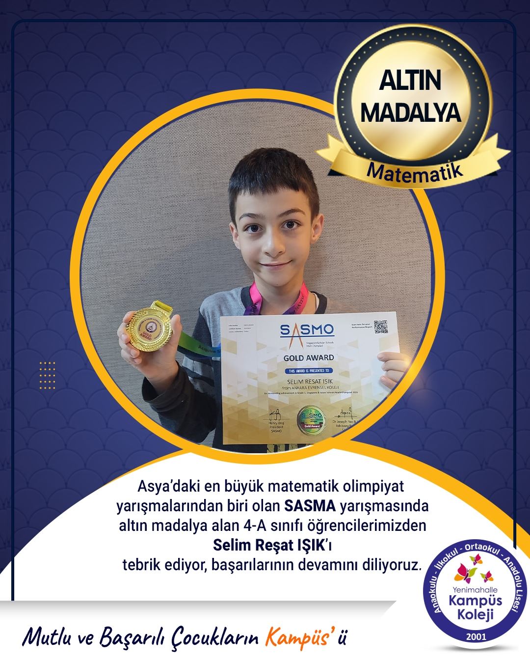Asya’daki en büyük matematik olimpiyat yarışmalarından biri olan SASMA yarışmasında altın madalya alan 4-A sınıfı öğrencilerimizden Selim Reşat IŞIK’ı tebrik ediyor, başarılarının devamını diliyoruz.